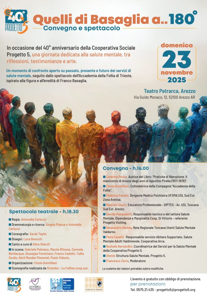 I festeggiamenti per i 40 anni della Cooperativa Progetto 5 proseguono; domenica 23 novembre il Teatro Petrarca di Arezzo ospiterà un pomeriggio dedicato alla salute mentale, alla memoria e alle nuove visioni di comunità. Dalle 16:00, un convegno aperto alla città ripercorrerà il viaggio che va dalla chiusura dei “Tetti Rossi” fino alle prospettive aperte […]